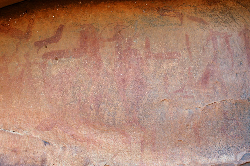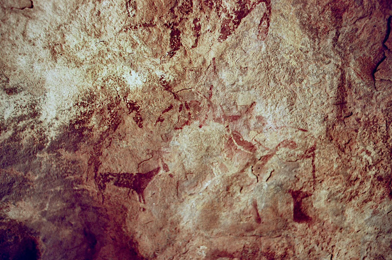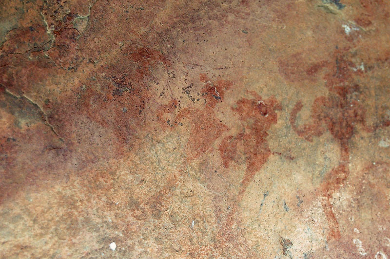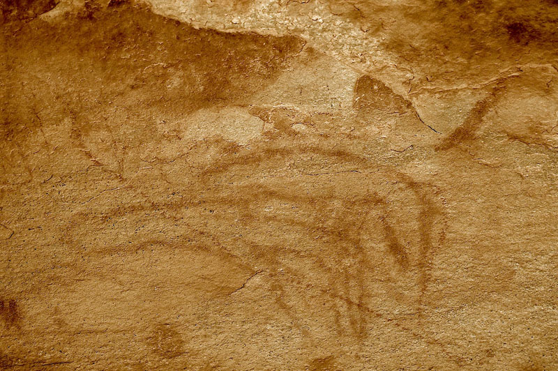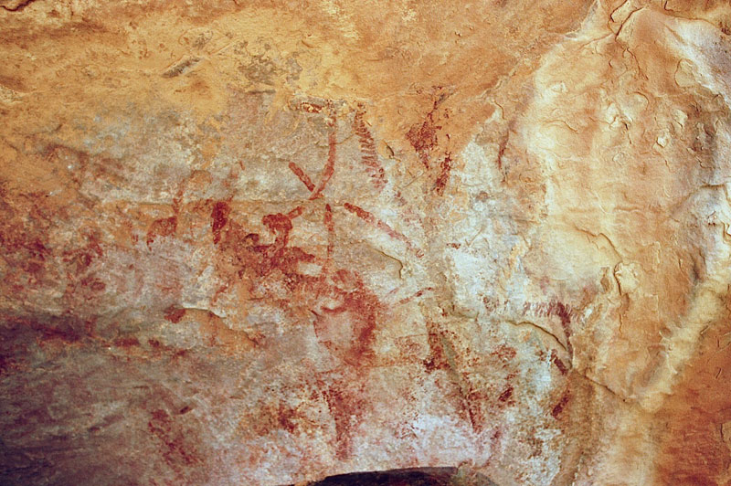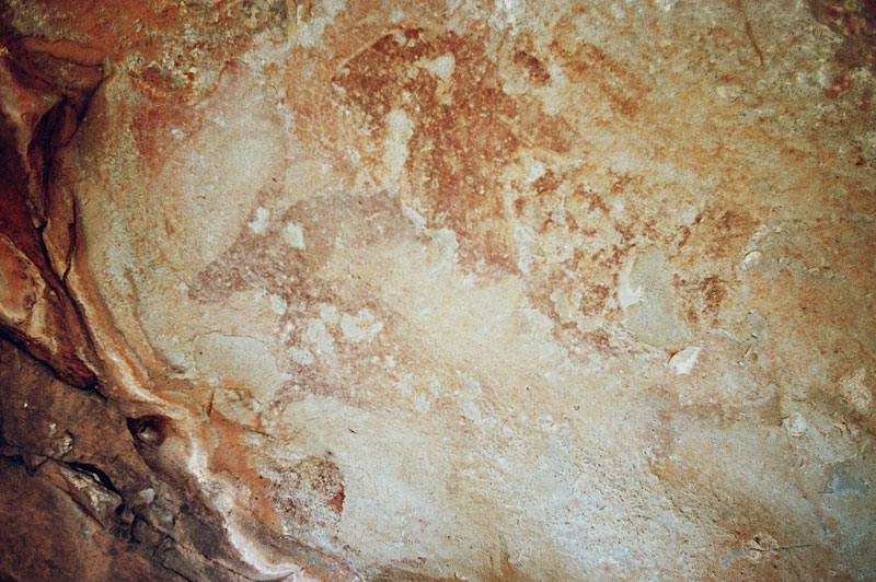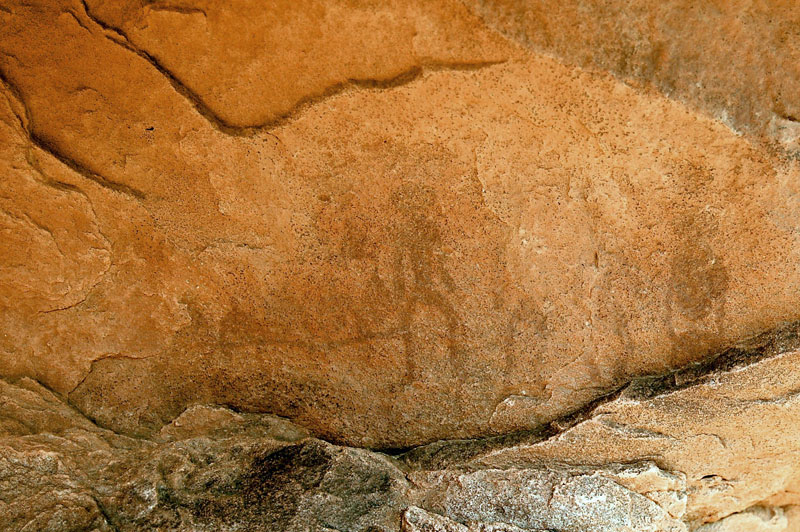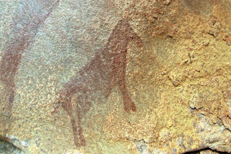 27°45,56’N - 10°37,36’W. Dans un grand abri sous-roches (vide de peintures), sous une petite avancée au niveau du sol, un magnifique bélier aux cornes enroulées, une grande antilope, un bovidé ? petit ensemble de qualité, comme quoi il ne faut rien négliger...