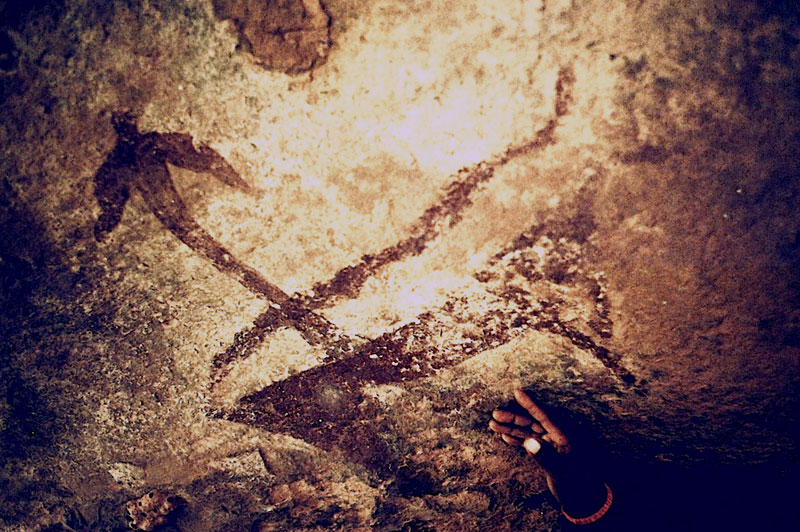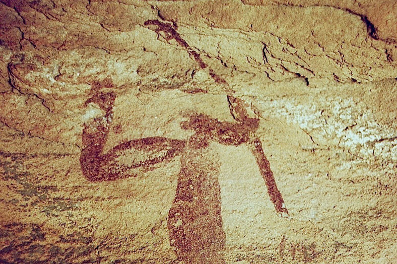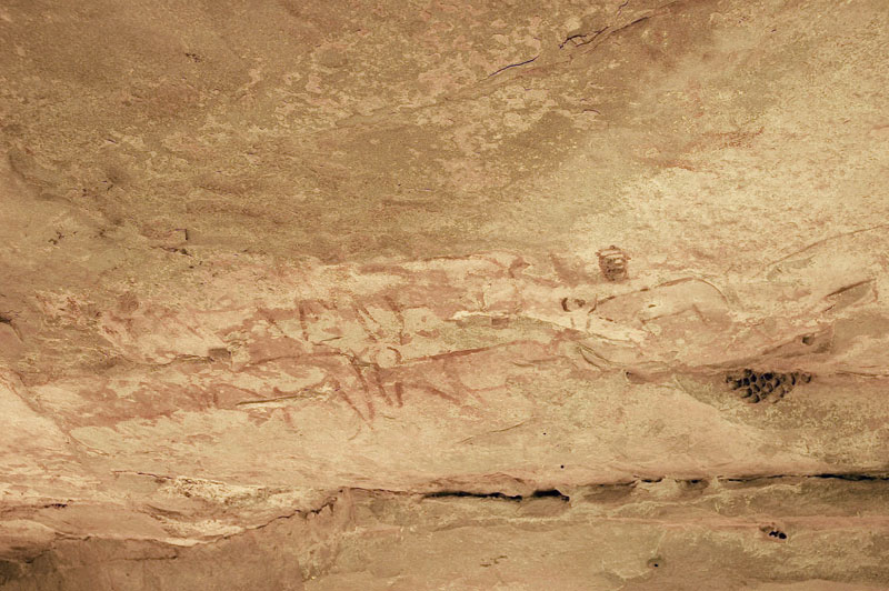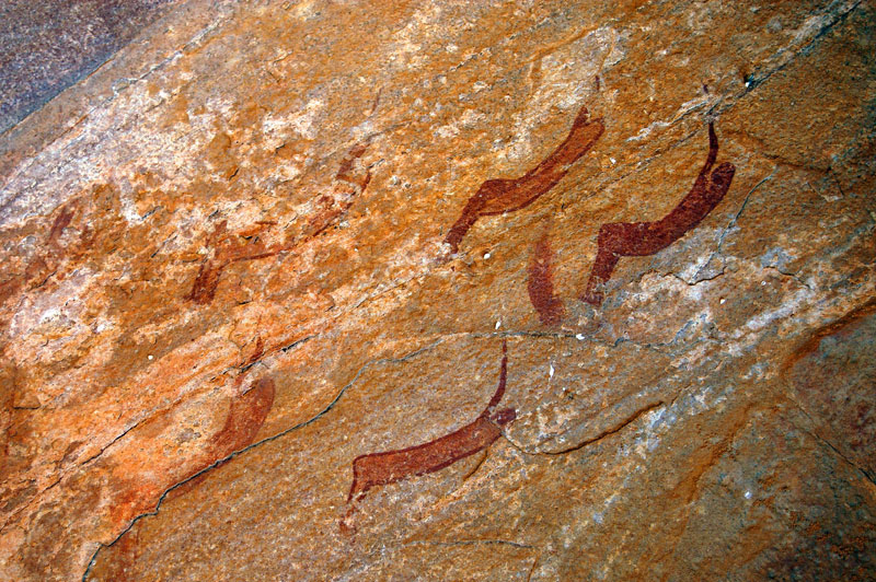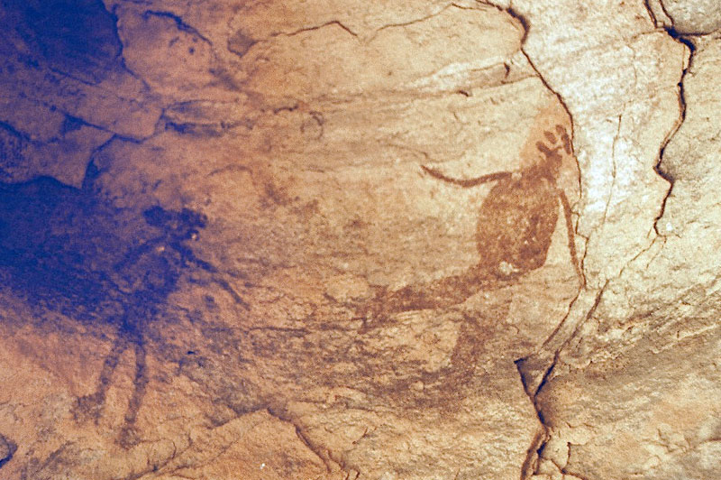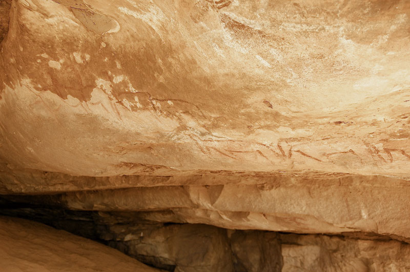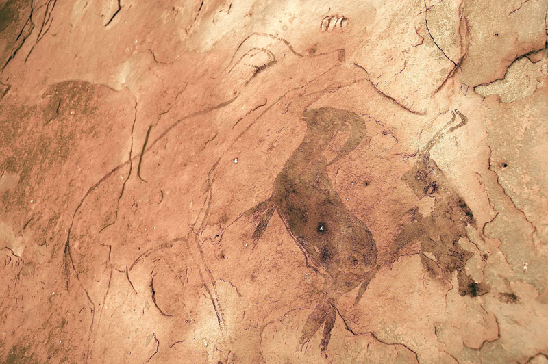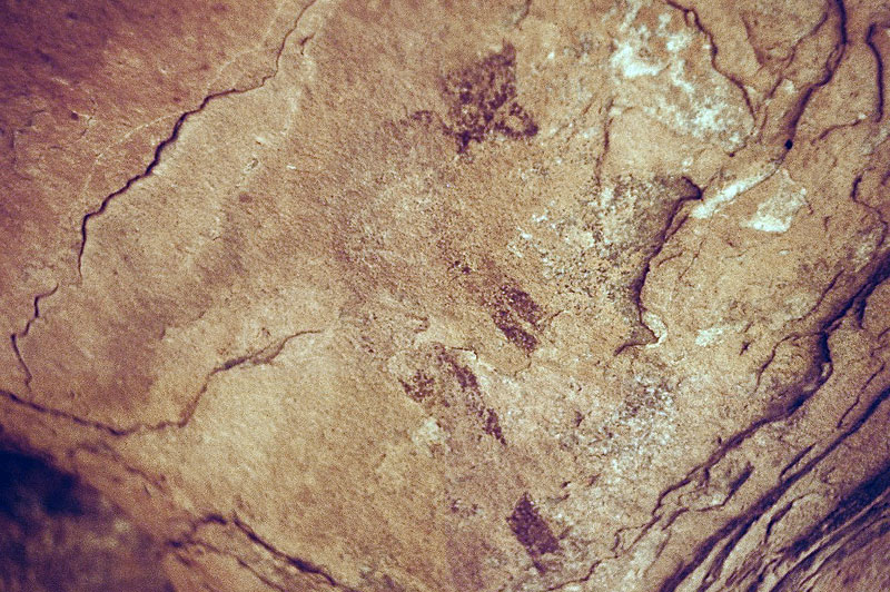 27°45,56’N - 10°37,36’W. Dans un grand abri sous-roches (vide de peintures), sous une petite avancée au niveau du sol, un magnifique bélier aux cornes enroulées, une grande antilope, un bovidé ? petit ensemble de qualité, comme quoi il ne faut rien négliger...