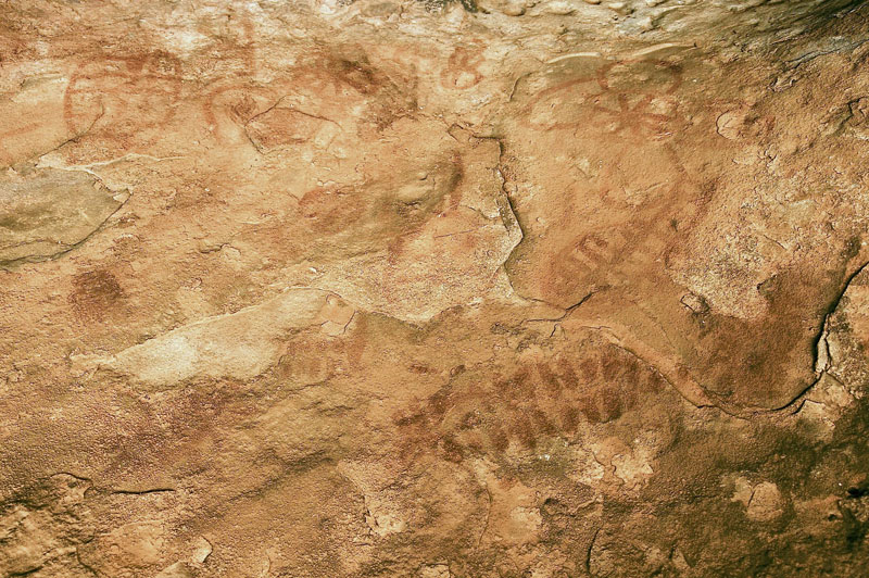 Les abris à peintures s’étendent sur trois cents mètres. Relevé des gravures les plus représentatives d’Ouest en Est.