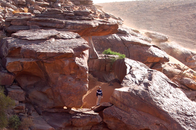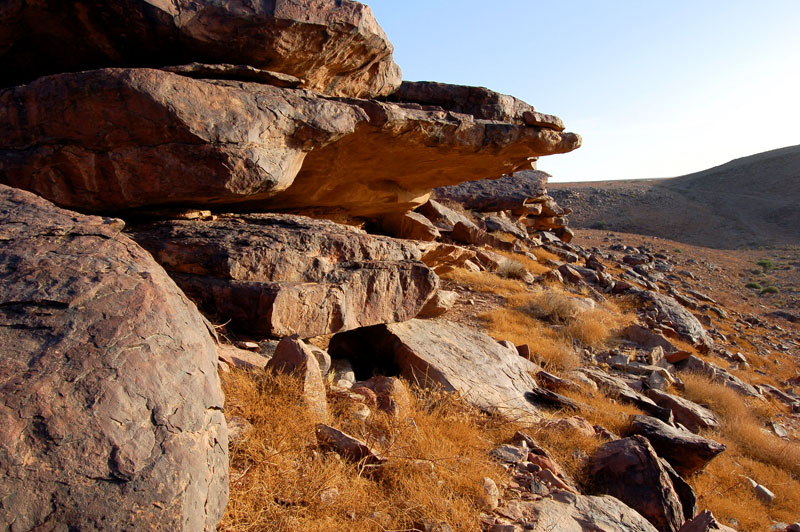 Km 27,4. 27°45,58’N - 10°36,40’W. Parking pour la visite des abris de la rive gauche, au Sud de la piste.