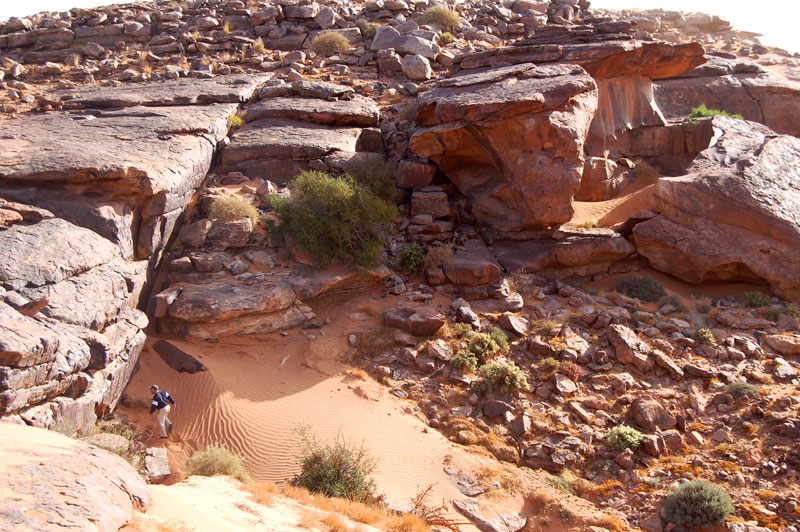 Km 11. 27°52,34’N - 10°38,60’W. 472 m. Embranchement à droite pour le site à peintures rupestres d’Aouinet Azguer.