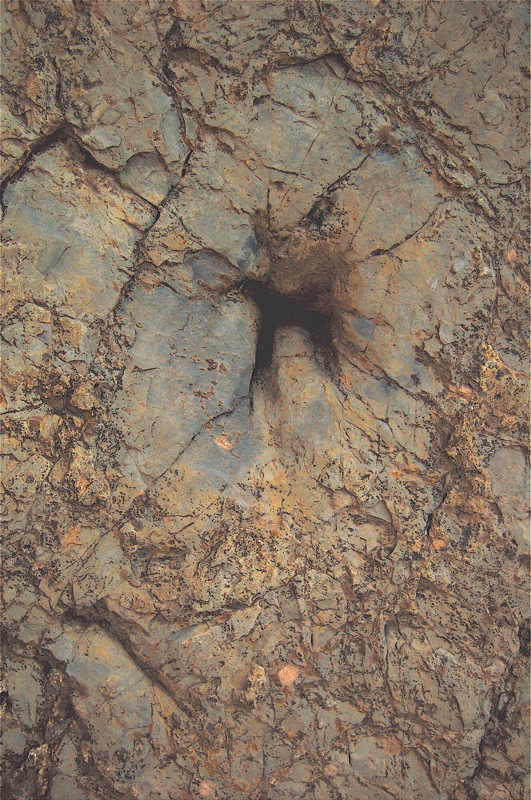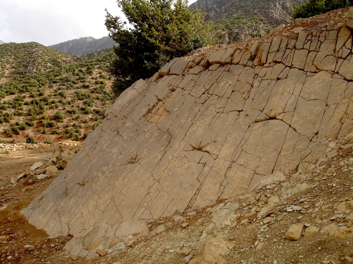 Km 38,5. 31°41’N - 06°41,84’W. 1644 m. Aguerd Zougaren. A droite de la piste, début de la strate inclinée comportant des cheminements de traces de petits dinosaures tridactyles; le site s’étend sur environ 60 mètres.
