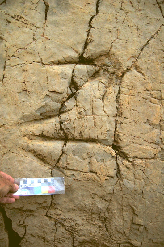 Dans les deux derniers cas, la naissance du doigt III s'enfonce beaucoup dans la couche. Par contre dans le cas de la figure 2 (trois doigts serrés), la base des doigts n'est pas imprimée.