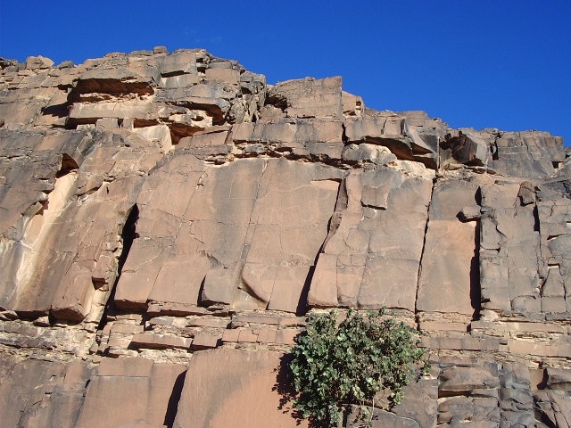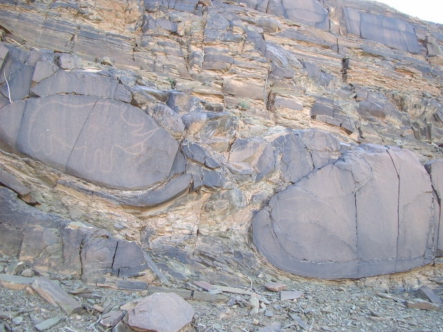 Sur la piste d’Akka à la route d’Icht, dans l’oued Tamzarar, sur la falaises rive gauche, la majorité des gravures est située sur des parois verticales à partir d’environ 10 mètres de hauteur.