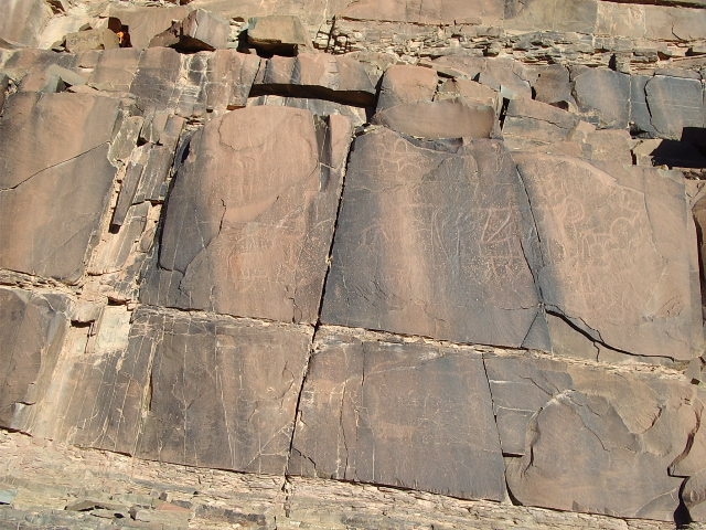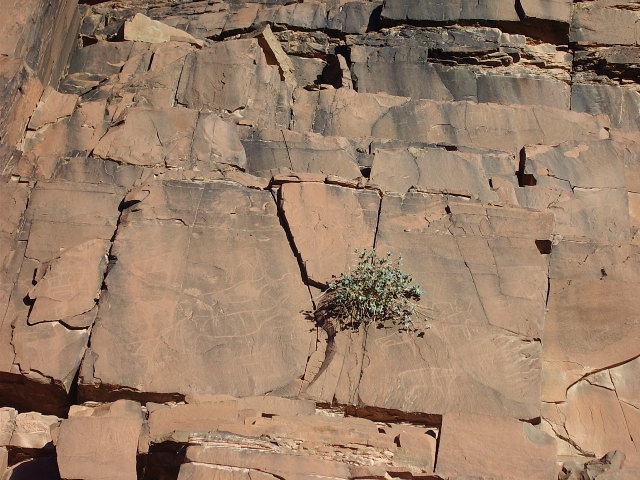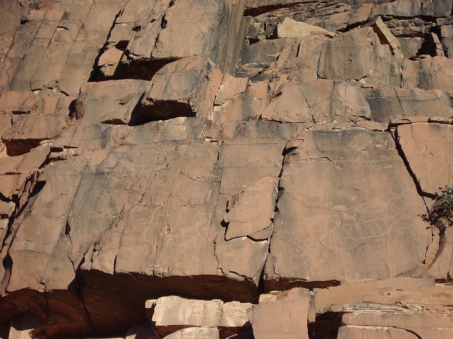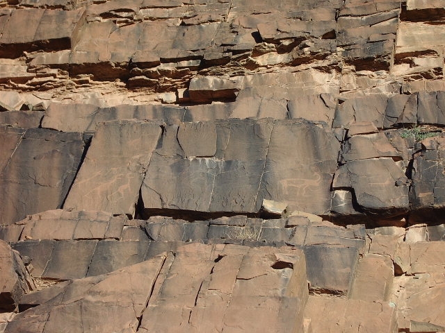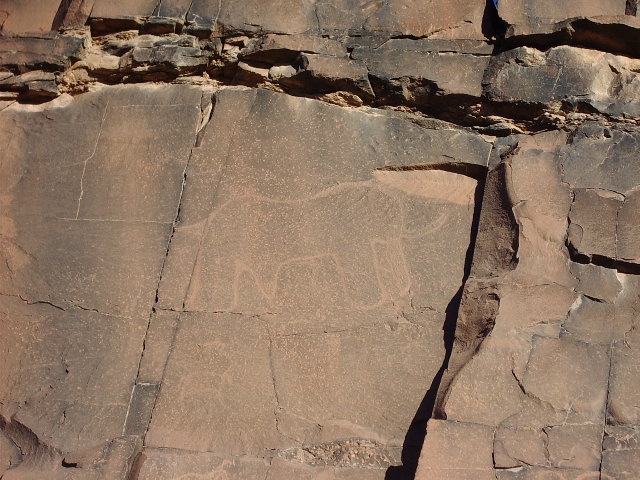 Plus loin sur la piste proche d’un site sans grand intérêt : gravures sur parois verticales, de deux rhinocéros, belle frise d’autruches, plusieurs anthropomorphes dont un couple avec un chien et des bovidés.