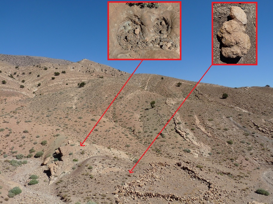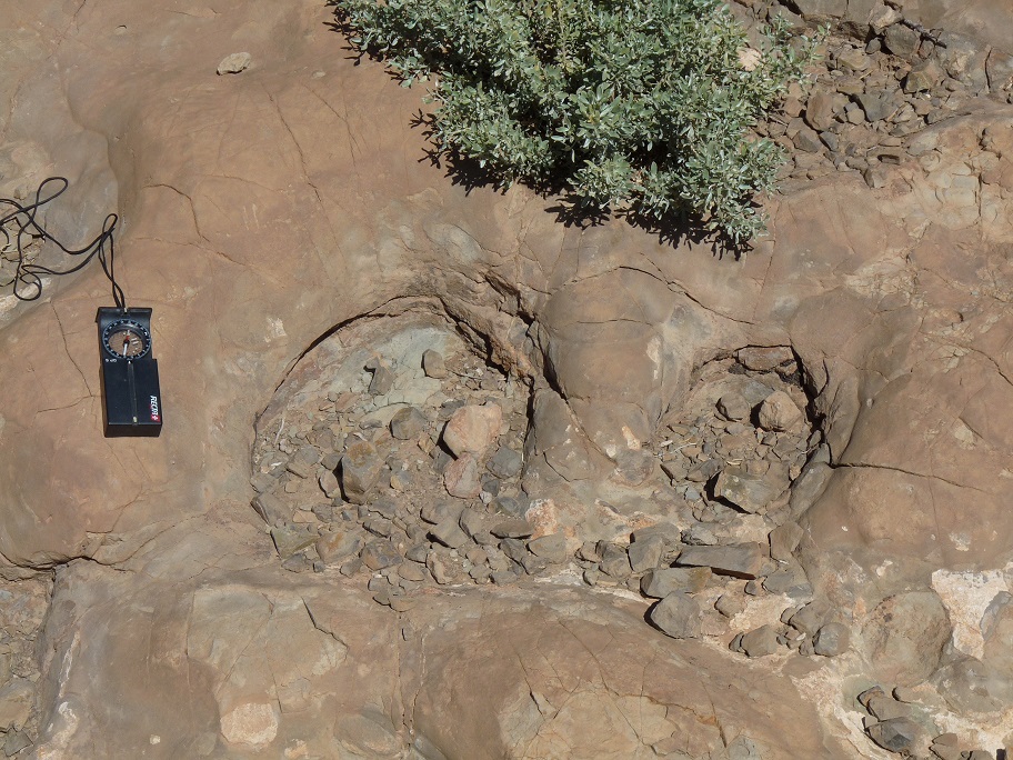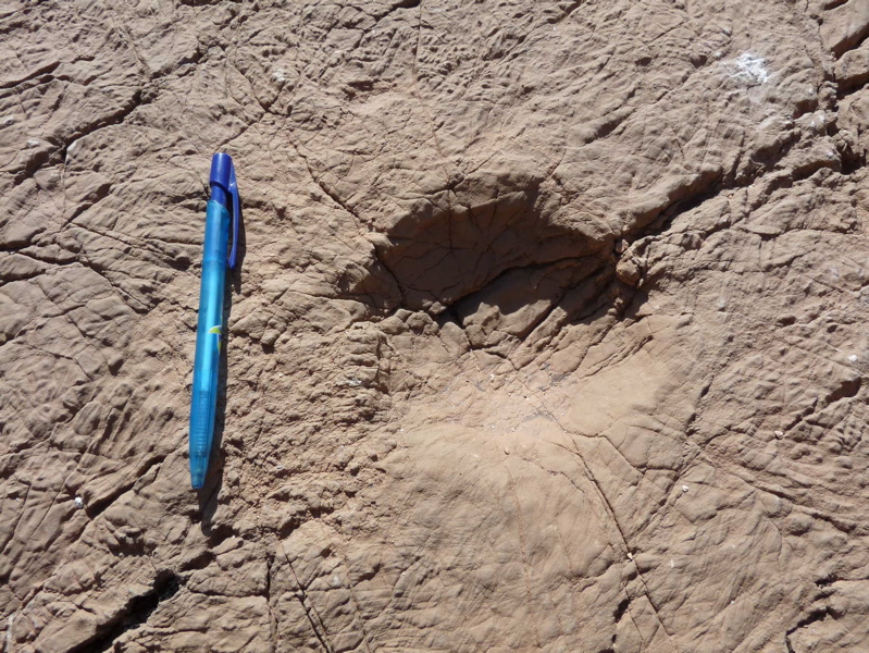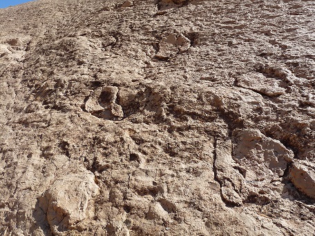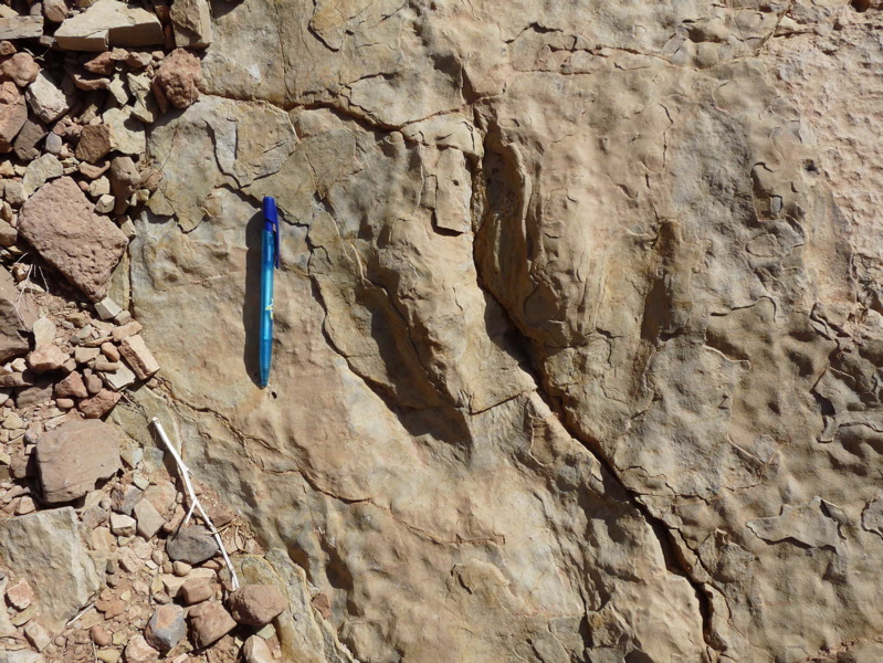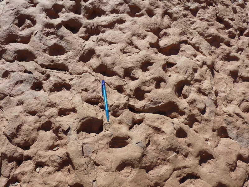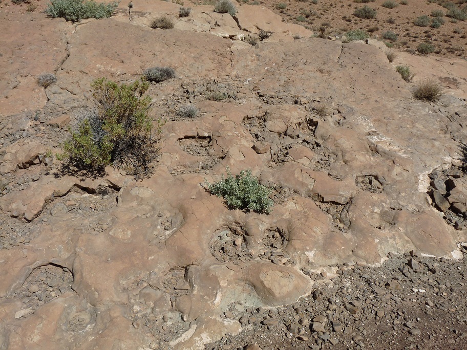 31°27,827'N - 06°09,623'W : Strate avec des empreintes de sauropodes, et à côté, probabilité de coprolithes.