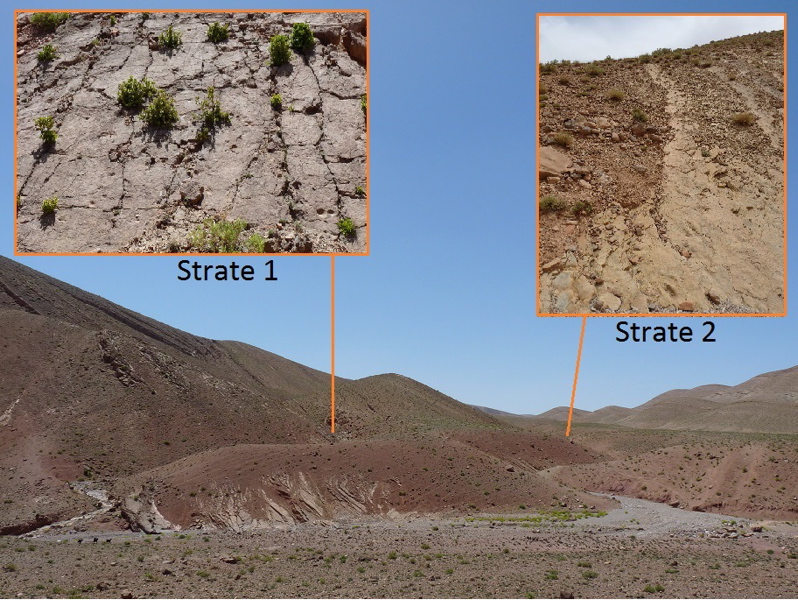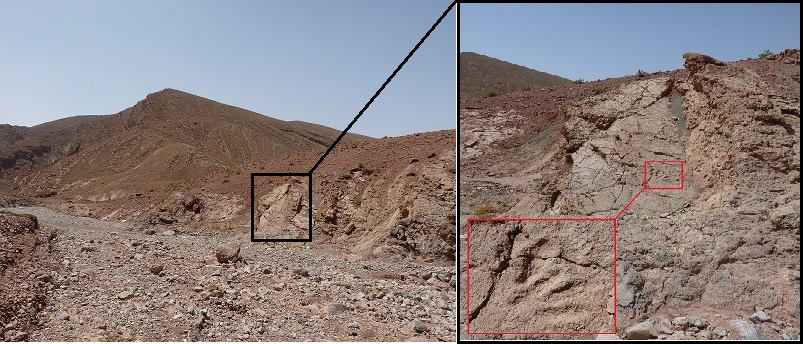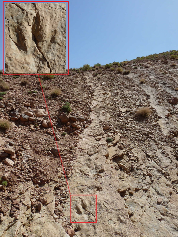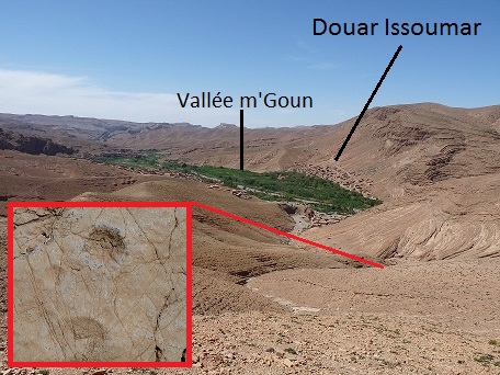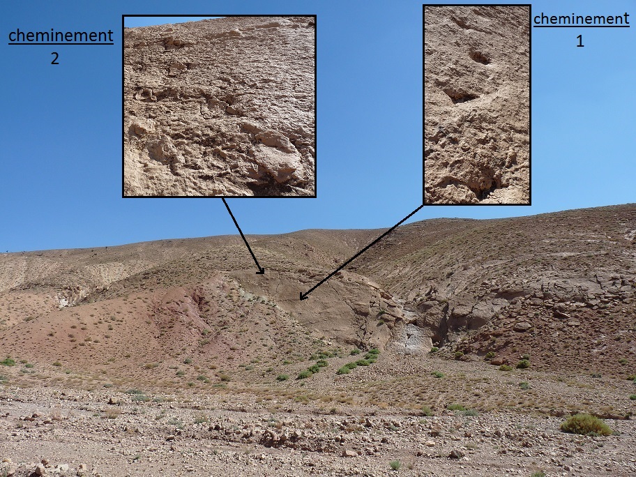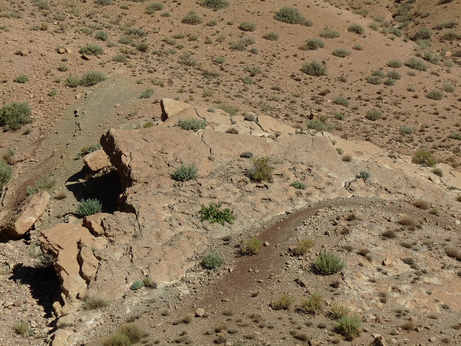31°26,54'N - 06°10,06'W. 1792m. Timtda, direction Alemdoum, à gauche au bord de la route, descendre vers un petit vallon, strate et empreinte visible de la route.