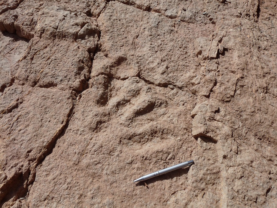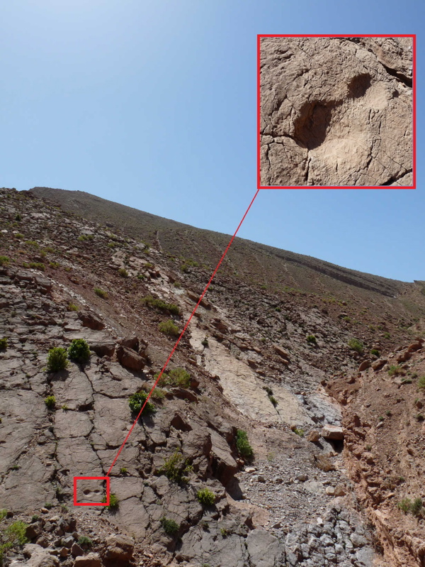 31°26,52'N – 06°10,07'W. Strate avec une seule empreinte tridactyle de 18 cm.