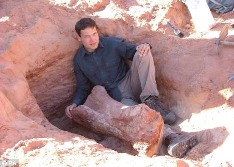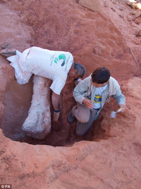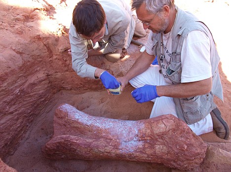 Le Docteur Dave Martill et Nizar Ibrahim en train d'extraire un fragment d'os du sauropode.