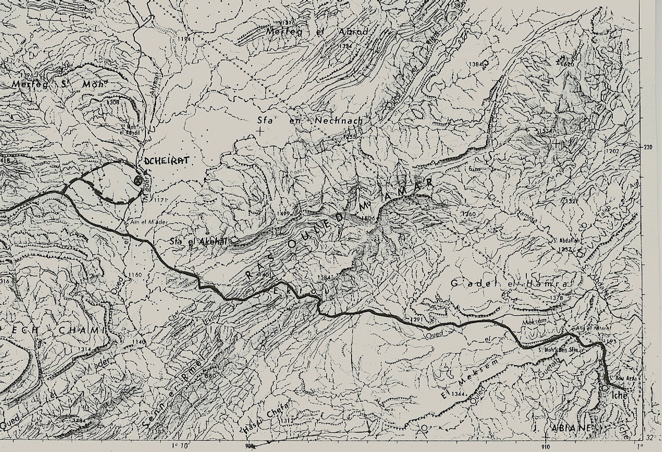 Km 3,5. 32°35,14’N - 01°10,94’W. Laisser la piste militaire pour suivre des traces par la droite, cap au Sud-Est vers l’oued el Mader el Ahmar. Vous devez serrer la bordure du relief par la droite pour rejoindre le site à gravures, c’est-à-dire circuler en hors piste entre la bordure de l’oued (en surplomb du lit de l’oued d’environ 2 mètres) et le piémont de la petite chaîne où se trouvent les gravures.
