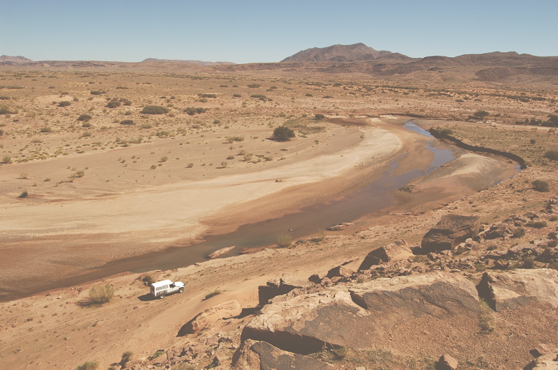 Pour regagner la route, autrefois l’on pouvait circuler directement dans le lit de l’oued. En eau en octobre 2010, vous devez continuer pendant quelques centaines de mètres votre parcours hors piste entre le bord de l’oued et le relief puis tourner à droite pour rejoindre des traces à l’Ouest.