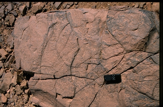 Ensuite succession de dalles à graffitis côté petite vallée d’oued intérieure.
