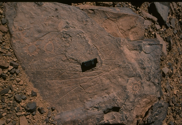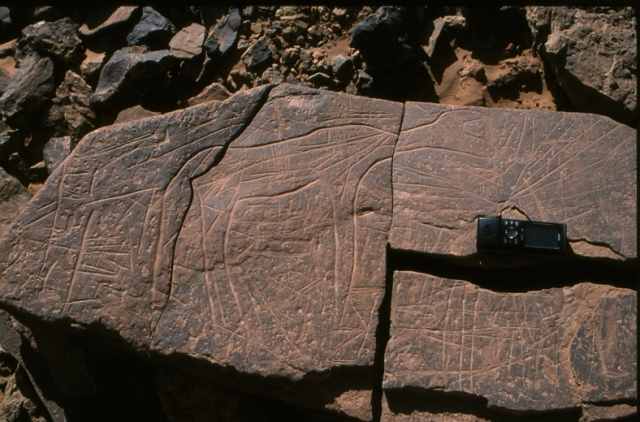 Sur une grande terrasse en bordure de l’oued Draa et en surplomb de la séguia, éléphant sans tête au trait profond poli sur grosse dalle de réemploi pour couvrir un sarcophage dans un tumulus fouillé. La partie cassée où se trouvait la tête de l’éléphant date probablement d’une période antérieure à la construction des tumulus de la nécropole.
