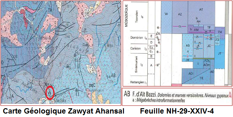 Les reliefs, en face du douar encadré par jebel Tarahalt (2532m), offrent un paysage géologique majestueux du jurassique inférieure, un amphithéâtre de strates de dolomies et marne versicolor très étonnantes, avec des empreintes de dinosaures, surtout sur la partie à l'entrée des gorges de l'oued Mgoun vers l'amont.