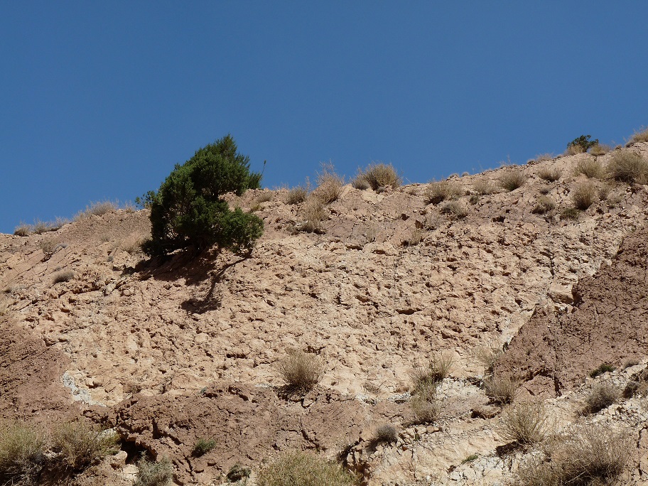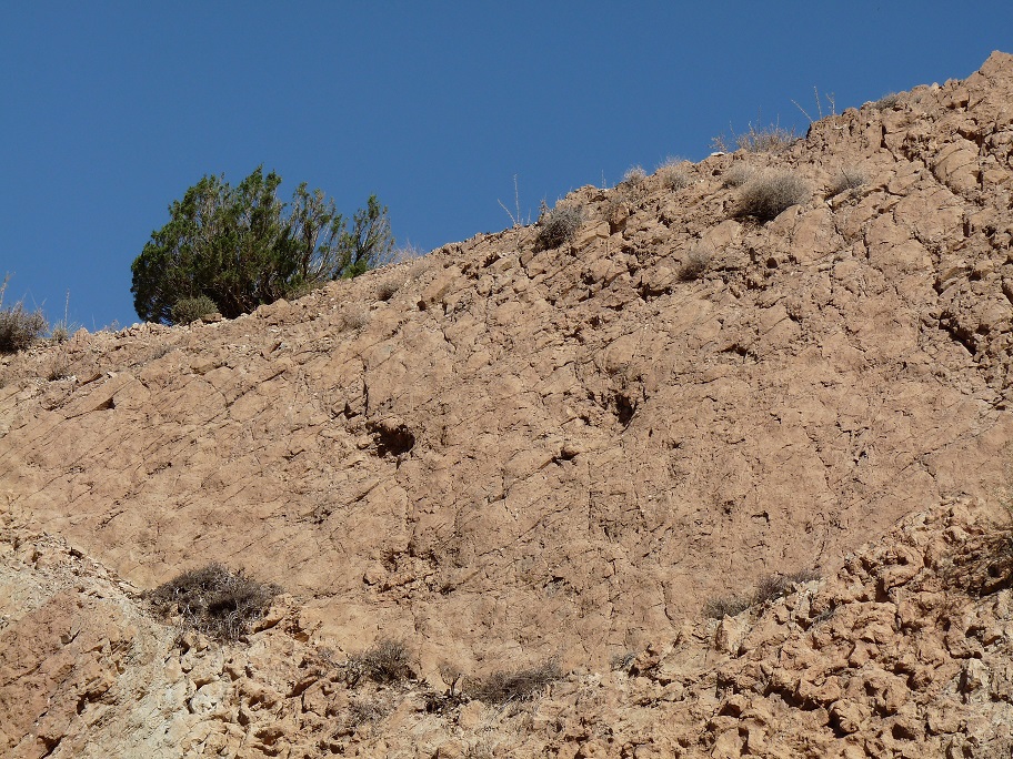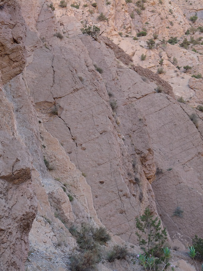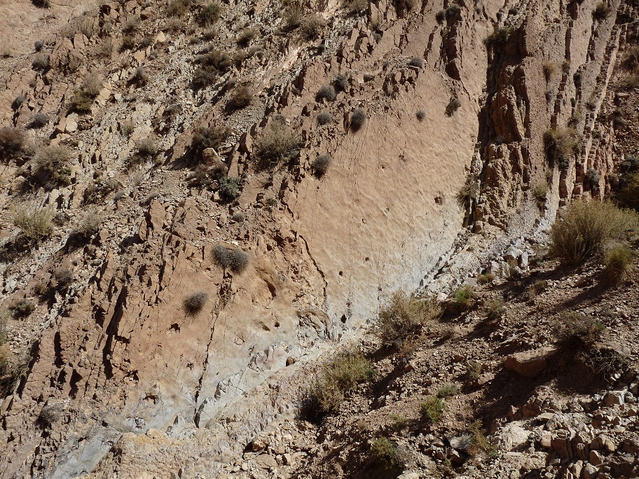 31°30,13'N – 06°07,40'W. 1756m. Arrivée devant des strates de couleur ocre presque verticales, cap nord-ouest; la dernière présente quelques petites empreintes rondes.