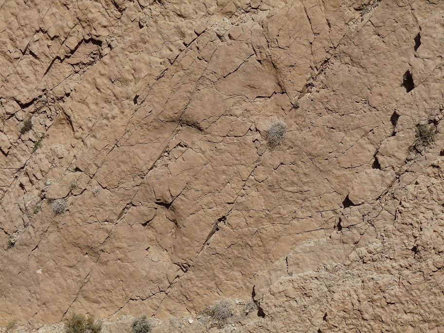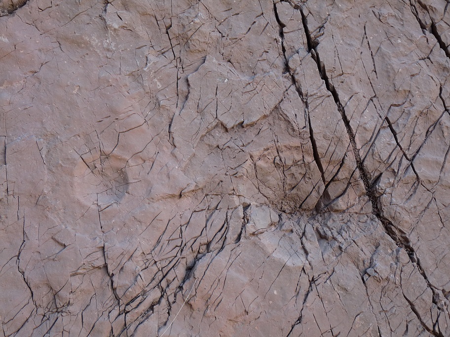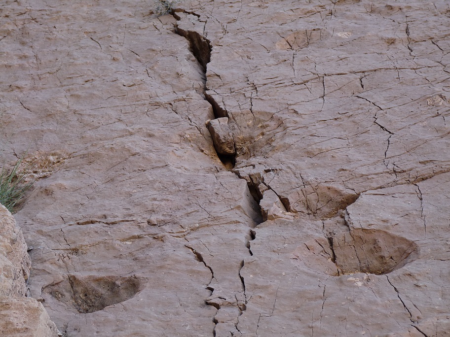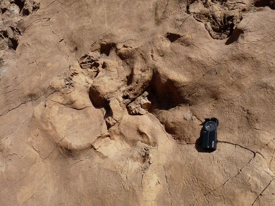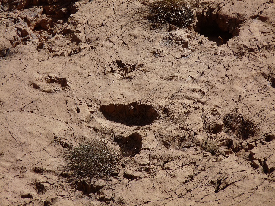 31°30,20'N – 06°07,18'W. 1619m. Arrivée devant une très large strate, présentant plusieurs cheminements d'empreintes, de différentes formes et tailles. Présence de strates endommagées par l'érosion.