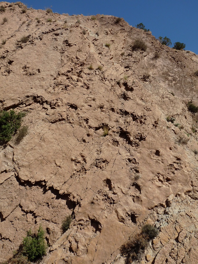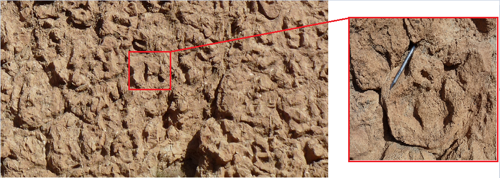 Cette partie présente de nombreuses strates avec des empreintes de plusieurs formes et de différentes tailles, mais presque toutes sont floues. Peut-être que ces cheminements se sont déroulés sur un substrat très mou, ce qui réduit les caractéristique des empreintes. La densité des traces sur les strates signifie la présence d'un lieu de stationnement ou une zone très fréquentée par les dinosaures