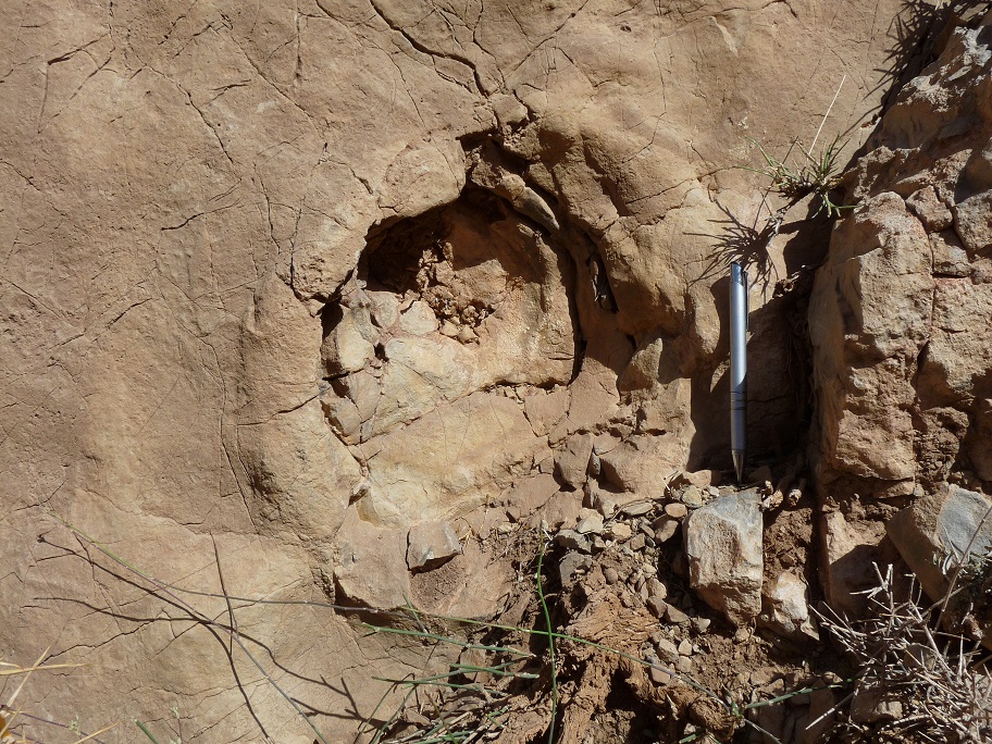 A côté, autre exemple de remblayage, la dépression de l'empreinte et remplie par une couche de boue sus-jacente d'une couleur différente.