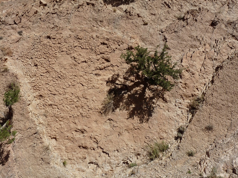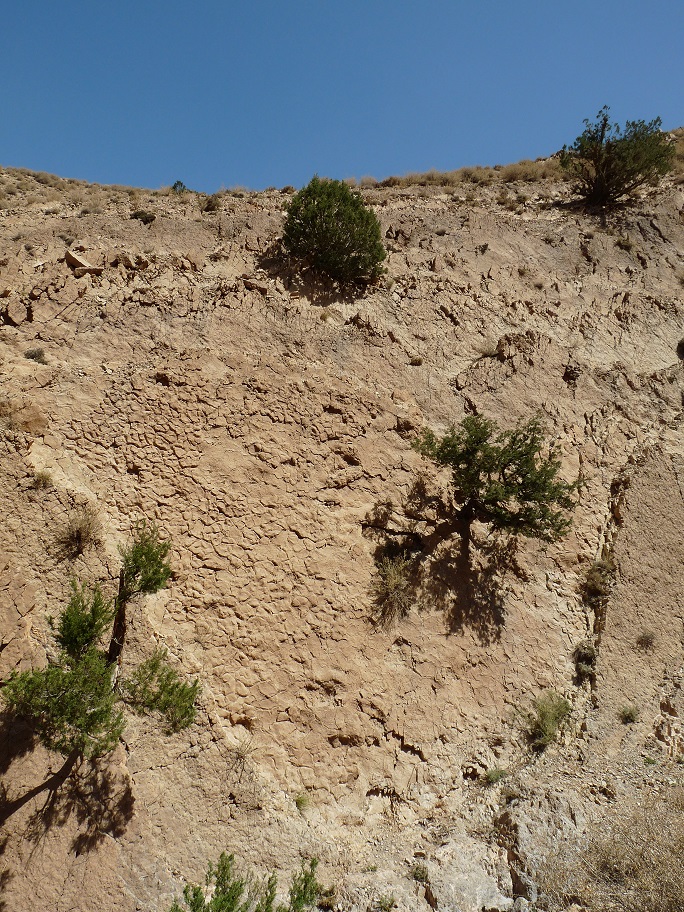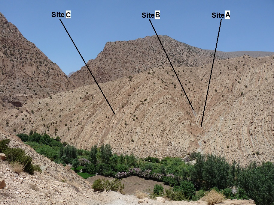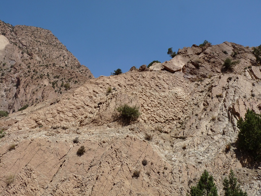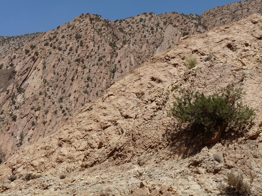 31°30,12'N – 06°07,19'W. 1594m. Arrivée au premier site; remonter un petit vallon très escarpé, cap Est. Les strates à empreintes sont visible au début du vallon par la droite.