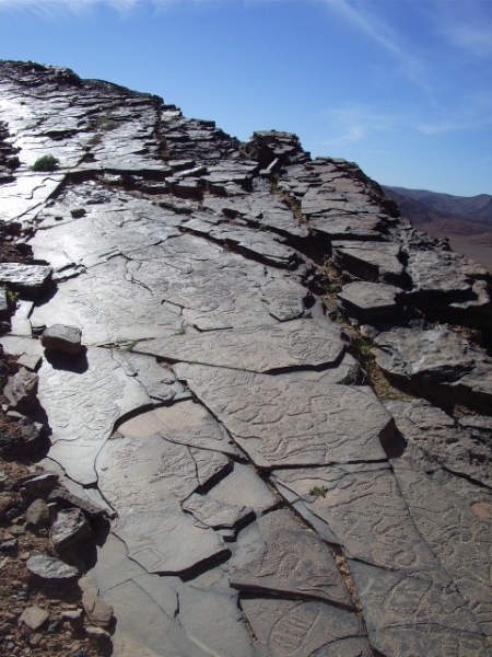 Les dalles de grès présentant les gravures se trouvent à environ 400 mètres du départ de la bordure de la falaise qui finit en surplomb de 15 à 20 mètres au-dessus de l’oued. Quelques gravures sans grand intérêt sont visible avant d’arriver au premier site sur le “plateau” qui s’étend sur environ 70 mètres de long sur 3 de largeur, site exceptionnel par ses centaines de gravures à thème géométrique. Les spirales, les cercles et autres formes existent dans la majorité des sites du Sud marocain, mais jamais dans de telles proportions ni si nettement séparés des bovidés que dans ce site d’Imaoun. Un peut penser que ce plateau, ouvert au ciel, était un lieu propice pour des signes sacrés, idéologiques ou symboliques, tandis que le sujet plus banal des bovidés était essentiellement gravé sur des blocs plus près du niveau de la vallée de l’oued donc des pâturages de l’époque. Susan Searight, influencée par des articles traitant de l’emploi d’allucinogènes dans la production de l’art rupestre, a avancé une autre interprétation. Beaucoup de ces figures géométriques, s’apparentant aux images obtenues par des chamans dans un état altéré de la conscience, font penser que les pasteurs qui fréquentaient le site étaient susceptibles d’atteindre un tel état. Quoi qu’il en soit, la variété des gravures et le soin avec lequel elles ont été piquetées puis polies, indiquent un lieu avec un caractère bien particulier, sacré ?, mystique ? ou simplement la symbolisation d’un lieu de ralliement des troupeaux et des hommes lors de grands rassemblements de tribus.