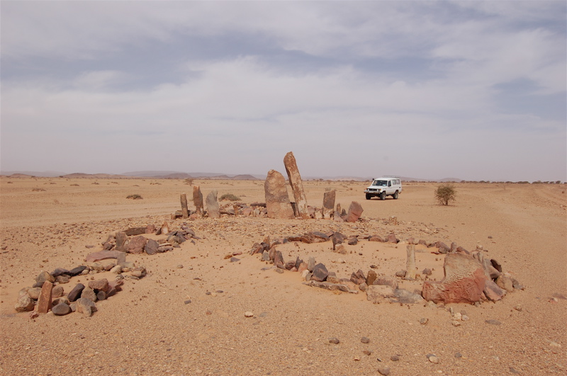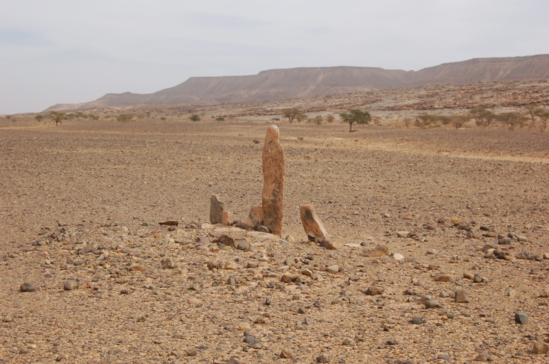 Km 7,5. 25°13,55'N - 12°22,95'W. Tumulus à bétyles sur la gauche de la piste et divers.