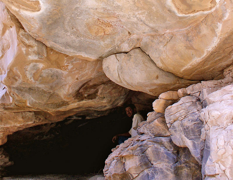 Exposée au nord-est, elle mesure environ 4 m de large à son entrée, 1,50 m de haut et 12 de profondeur avec un sol en pente vers l’extérieur. L’ouverture est obstruée de blocs de calcaire gréseux effondrés et par des murettes de bergeries. Le plafond est très irrégulier et le sol est formé d’une couche compacte de sédiments, de fumier et de fientes d’oiseaux de proie. L’entrée est surmontée d’un énorme bloc qui forme un auvent. C’est au plafond de cet auvent que se trouvent les motifs peints en couleur rouge, constitués de formes ovales, unies, décorées à l’intérieur par une série de pointillés rangés en demi-lune, ainsi que des bâtonnets. A l’intérieur de la grotte, on remarque les dégâts causés par des infiltrations d’eau et par des dépôts de suie. Quelques traces de peintures subsistent dans une alvéole du plafond endommagé. Il s’agit d’un alignement de pointillés parallèles peints en teinte noire, effectués probablement au doigt, et recouvert d’une couche de calcite. L’étude d’Heckendorf et Salih avance que la fréquentation de la cavité, à la fois par les autochtones et les touristes, a contribué à l’accélération du processus de détérioration des peintures. Je pense qu’en ce qui concerne la fréquentation par les touristes, il ne faut pas trop s’avancer, car des renseignements recueillis sur place indiquent que ce site sans grand intérêt ne voit que très rarement le passage d’Européens intéressés; de plus, vu la hauteur où se trouvent les peintures, l’haleine humaine, cause première d’une éventuelle détérioration, n’aurait qu’un effet quasiment nul dans une atmosphère aussi sèche.