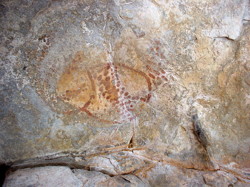 29°59,35’N - 06°25,16’W. L’abri sous-roches, transformé en azib par les bergers est sur votre droite, rive droite. Les peintures, mouchetis de points à l’ocre rouge et quelques traces indéfinissables se trouvent au plafond du porche d’entrée.