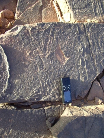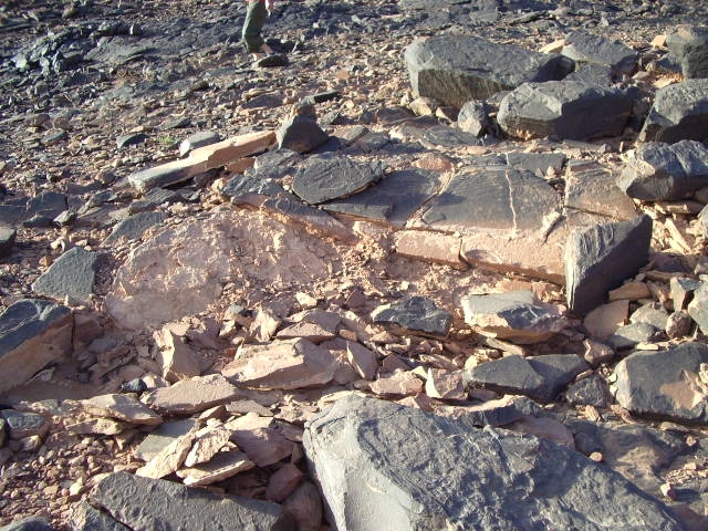 A une dizaine de kilomètres de Tafraout des Kem-Kem.30°36,95’N - 04°37,65’W. Restes de quelques gravures : bovidés et humanoïdes sur dalles