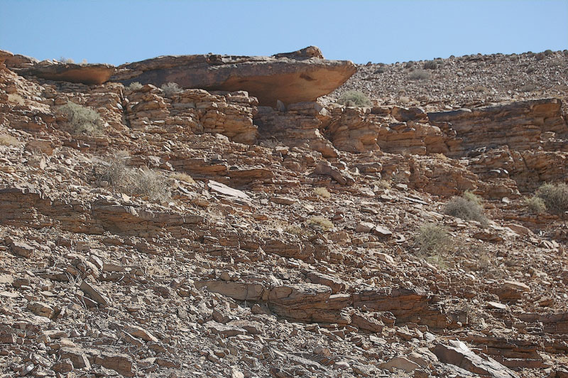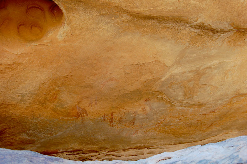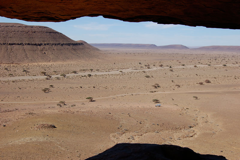 27°57,333’N - 10°47,345’W. Abri sous-roche, bas de plafond, où se trouvent les peintures d’anthropomorphes.