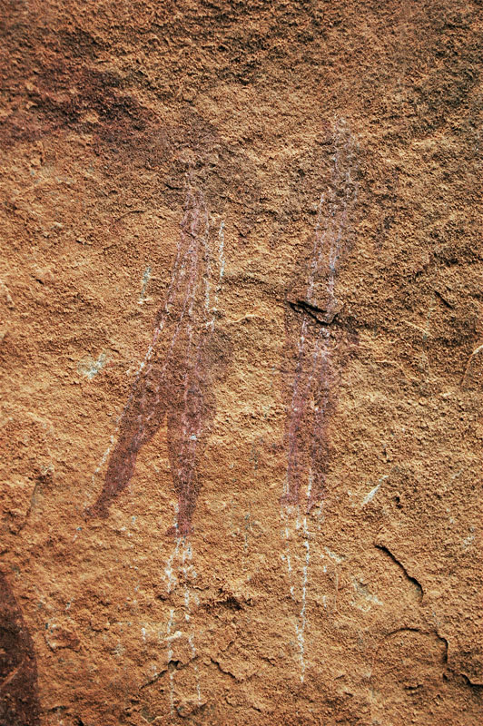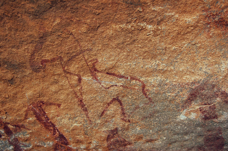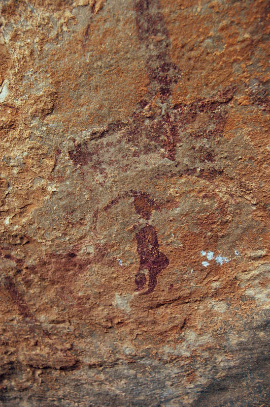 “Sur 3 ou 4 mètres de longueur et 1,5 de largeur, le plafond montre principalement 9 figures anthropomorphes en aplat ocre foncé, malheureusement médiocrement contrastées. Sur un premier panneau on peut identifier cinq petits personnages en aplat ocre. Les têtes sont réduites. Certains d’entre eux montrent de petits bras courts, écartés du corps. Deux d’entre eux semblent porter une courte jupe. Ils sont surmontés d’une figure dessinée par un trait ocre qui semble répondre à un quadrupède. Un autre panneau montre un assez grand personnage en aplat ocre foncé, à larges épaules, larges bras et une tête ronde. Les membres inférieurs sont mal perçus. Au-dessus de son épaule gauche, on voit deux petits personnages montrant une croupe saillante, des cuisses et des mollets charnus, des pieds relativement bien dessinés, de petits bras larges et courts, une tête réduite. Plus loin se trouve un autre petit personnage du même type. D’autres marques ocre plus estompées sont difficilement identifiables. On trouve aussi quelques points alignés. En première approche, ces personnages pourraient se classer dans un style rupestre archaïque évoquant le bovidien ancien du Sahara central...”