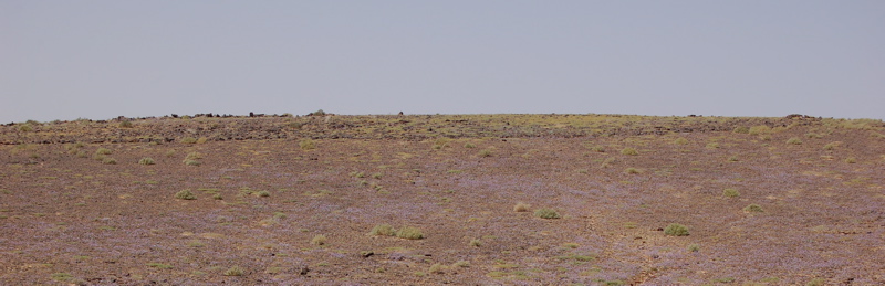 Km 26,2. 28°29,89’N - 09°13,44’W. Accès au plateau où se remarquent tout de suite de nombreux grands tumulus classiques, soit en dalles de pierres plates, soit en gros galets de l’oued.
