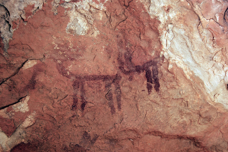 27°59,21’N - 10°46’W. Sous une rocher isolé, au pied du jebel Aousnir en bordure de l’oued Guelb, au plafond d’une alvéole au niveau du sol, peinture unique à l’ocre rouge de style tardif, représentant un cavalier. Traces d’une autre peinture à côté.