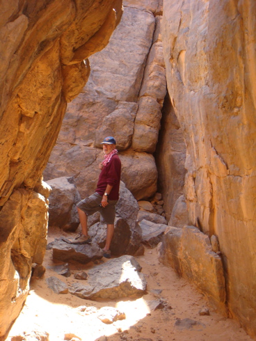 - 30°02,923’N - 06°21,575’W. 1158 m. Dans une sorte de couloir formé par deux gros rochers qui se touchent peintures au plafond de l’entrée : mouchetis de points à l’ocre rouge et quelques traces indéterminées. Une niche aménagée est visible.