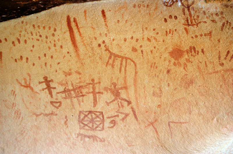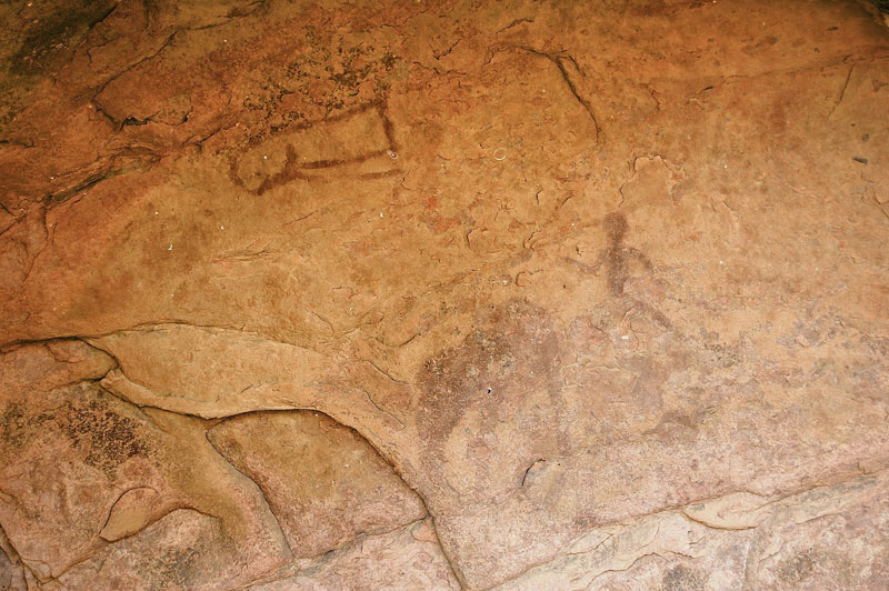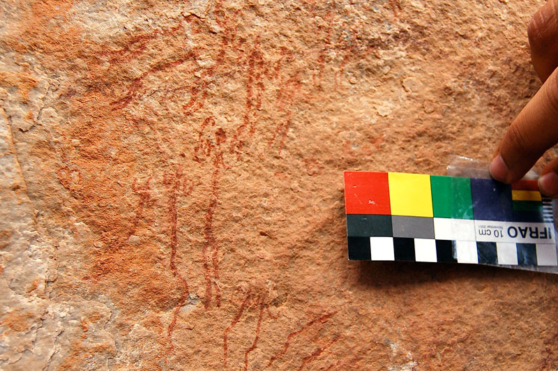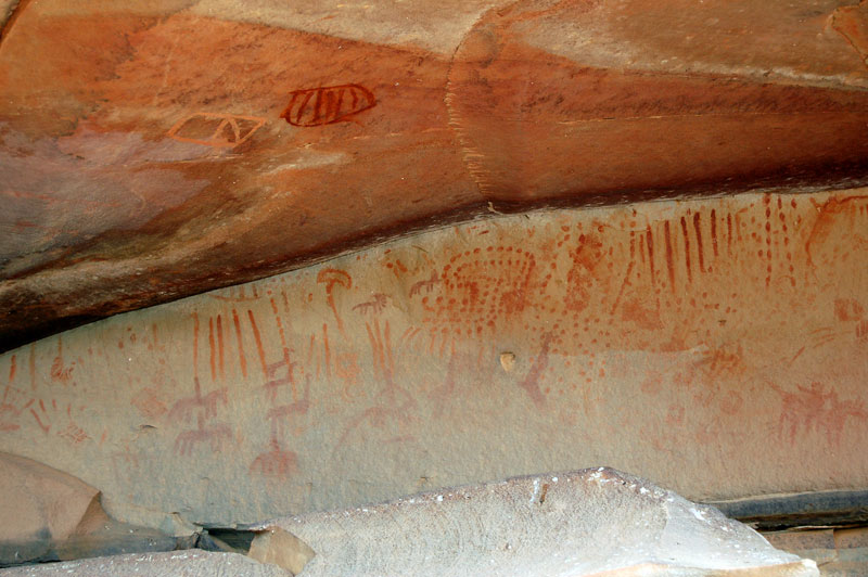 7. Dans le voisinage, à côté du déversoir, dans les hauteurs, abri sous-roche au plafond très bas et à l’accès un peu délicat. Son plafond, sur une surface d’environ trois mètres carrés, recèle un assemblage intéressant de petits anthropomorphes, à tête bâton, quelques zoomorphes de facture complètement différente des peintures des autres sites de cette vallée d’oued. Le tout est tracé à l’aide de dessins au trait de couleur ocre rouge foncé.