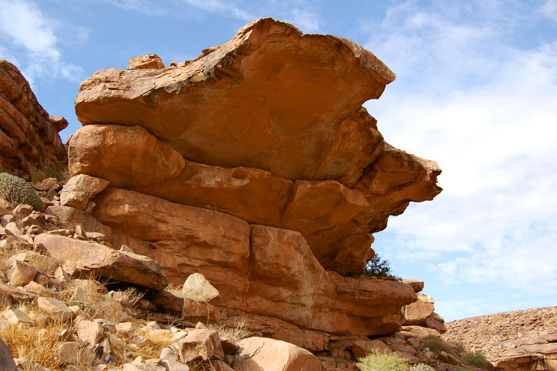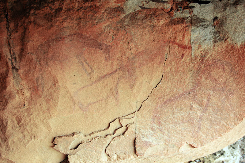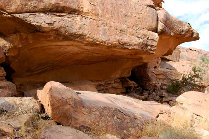 5. 27°45,93’N - 10°38,20’W. Autre abri majeur sur deux plans. En bas peintures assez grossières en partie effacées. Sur la corniche exceptionnel ensemble, dont une frise d’une quinzaine d’antilopes surlignées à la peinture blanche (invisibles du sol), une femme callipyge (mais peut-être un homme) face à un bovidé, un auroch et probablement une tête d’antilope. Accès délicat pour la corniche d’où est visible la frise d’antilopes.