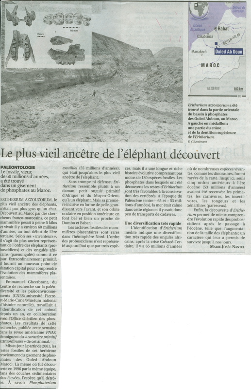 «C’est dans le cadre d'une convention de collaboration franco-marocaine entre notamment le Muséum et l'Office Chérifien des Phosphates, que l’on a découvert l'un des plus anciens ongulés modernes dans des niveaux paléocènes du Maroc. Âgé d'environ 60 millions d'années, ce mammifère fossile appartient à une nouvelle espèce nommée Eritherium azzouzorum. Il provient du même bassin à phosphates des Ouled Abdoun (Maroc) que Phosphatherium escuilliei, qui était, jusqu'à la découverte d'Eritherium, le plus ancien représentant des éléphants (55 millions d'années), mais de couches sédimentaires plus anciennes. C'est le plus ancien représentant connu des ongulés africains (paenungulés), et en particulier de l'ordre des éléphants (proboscidiens ) dont il conforte l'origine africaine ancienne.»