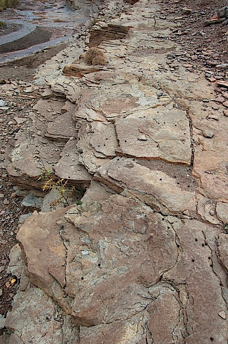 32°12,02'N - 05°38,87'W. 2413m. Arrivée à gauche sur une strate avec quelque empreintes tridactyles peu visibles. Retour par le même chemin.