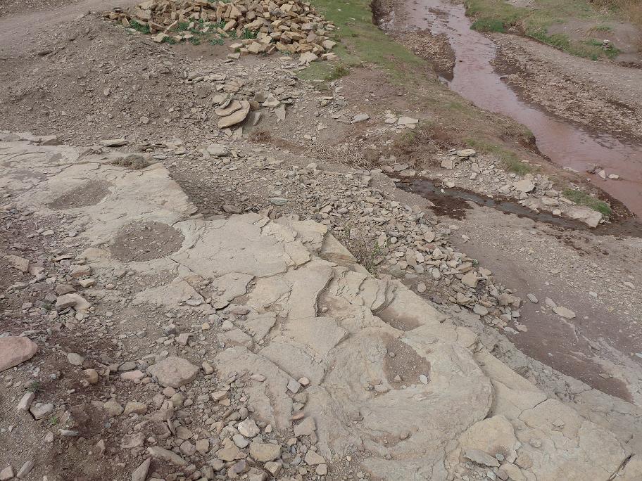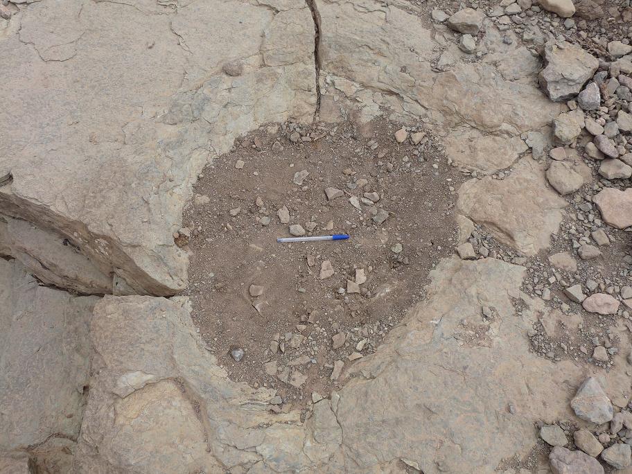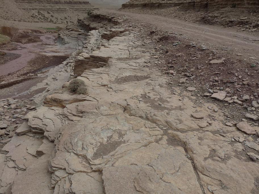 32°12,01'N - 05°38,87'W. 2409m. Strate grise avec les empreintes de sauropodes (0,90m), vraiment bien marquées.