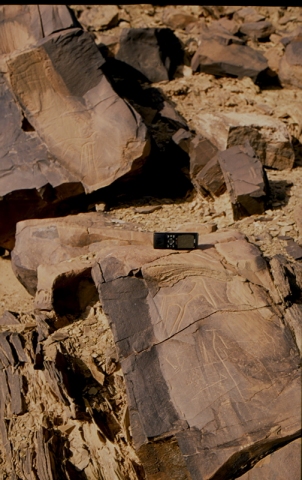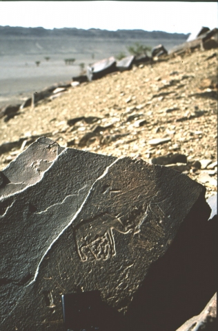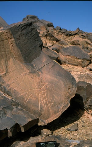Au sommet du relief à l’Est; une piste à gauche permet de rejoindre le pied du jebel en passant derrière la petite palmeraie. Antilope Tazina, à la tête manquante : tentative manquée de desquamage de la dalle pour s’approprier la gravure.