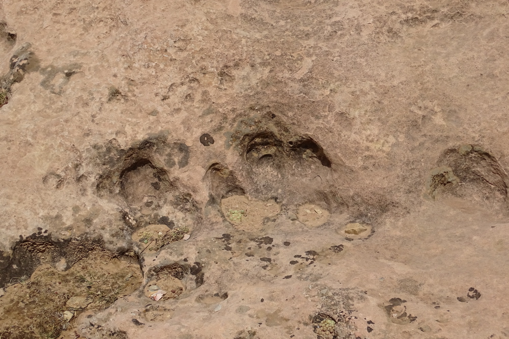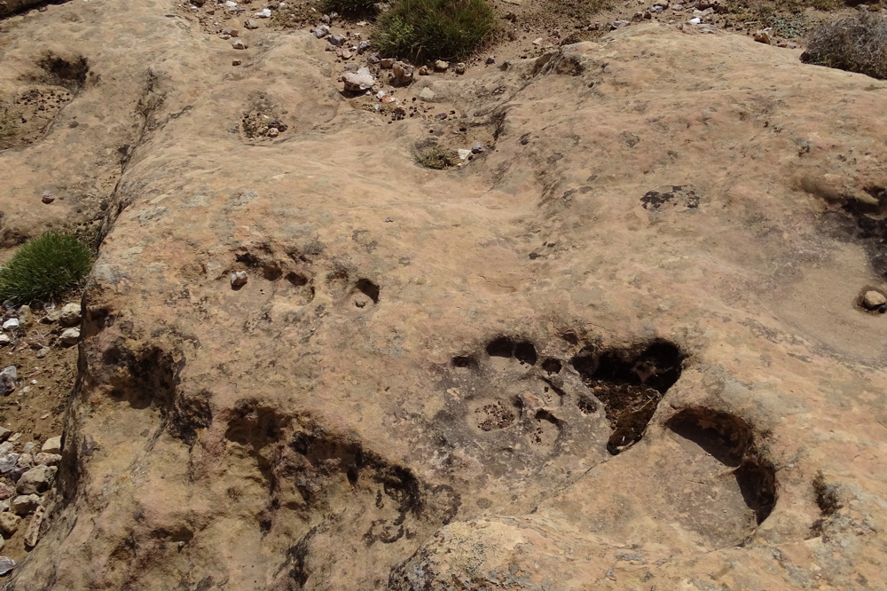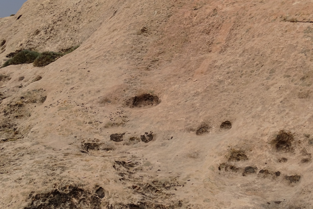 Après 100 mètres, sur votre droite, strate de dalles rocheuses plates ou légèrement inclinées, forte probabilité d'empreintes de dinosaures sauropodes, atteignant pour certaines un mètre de diamètre.