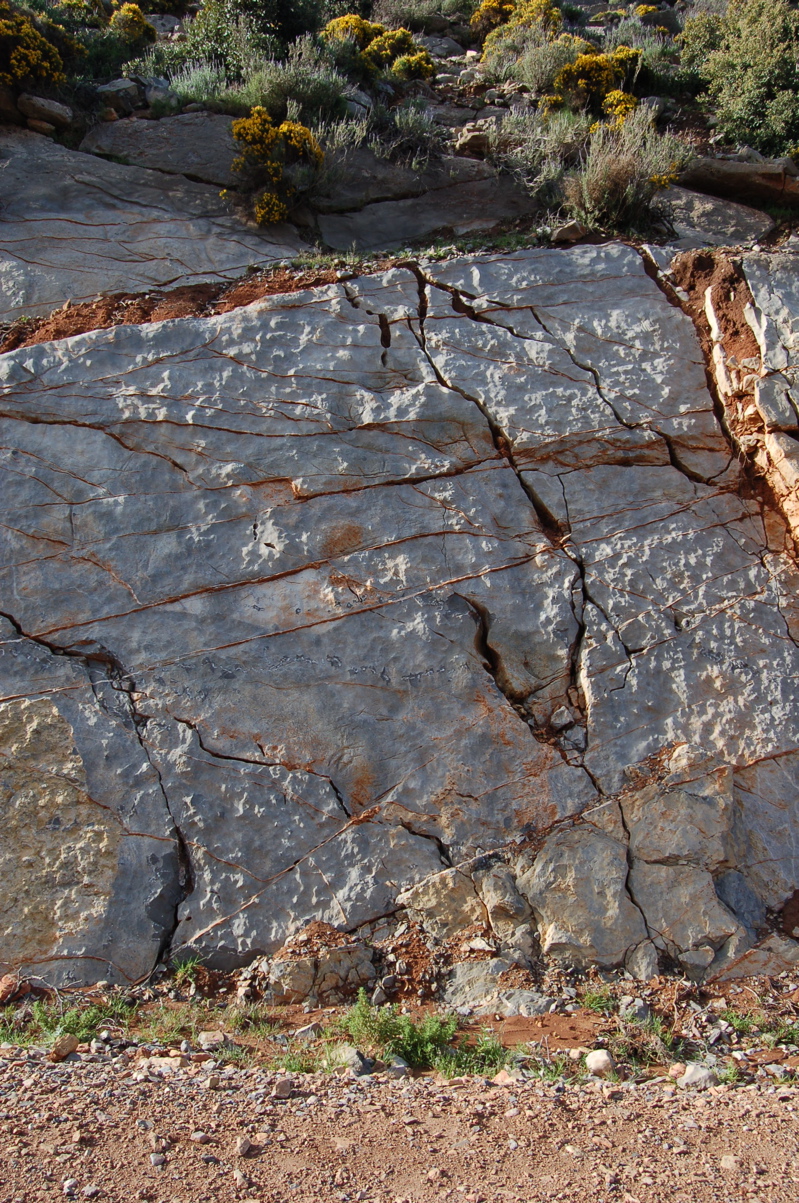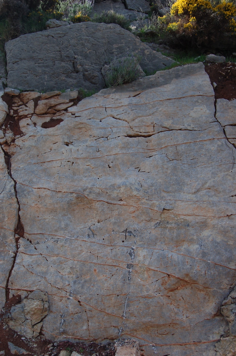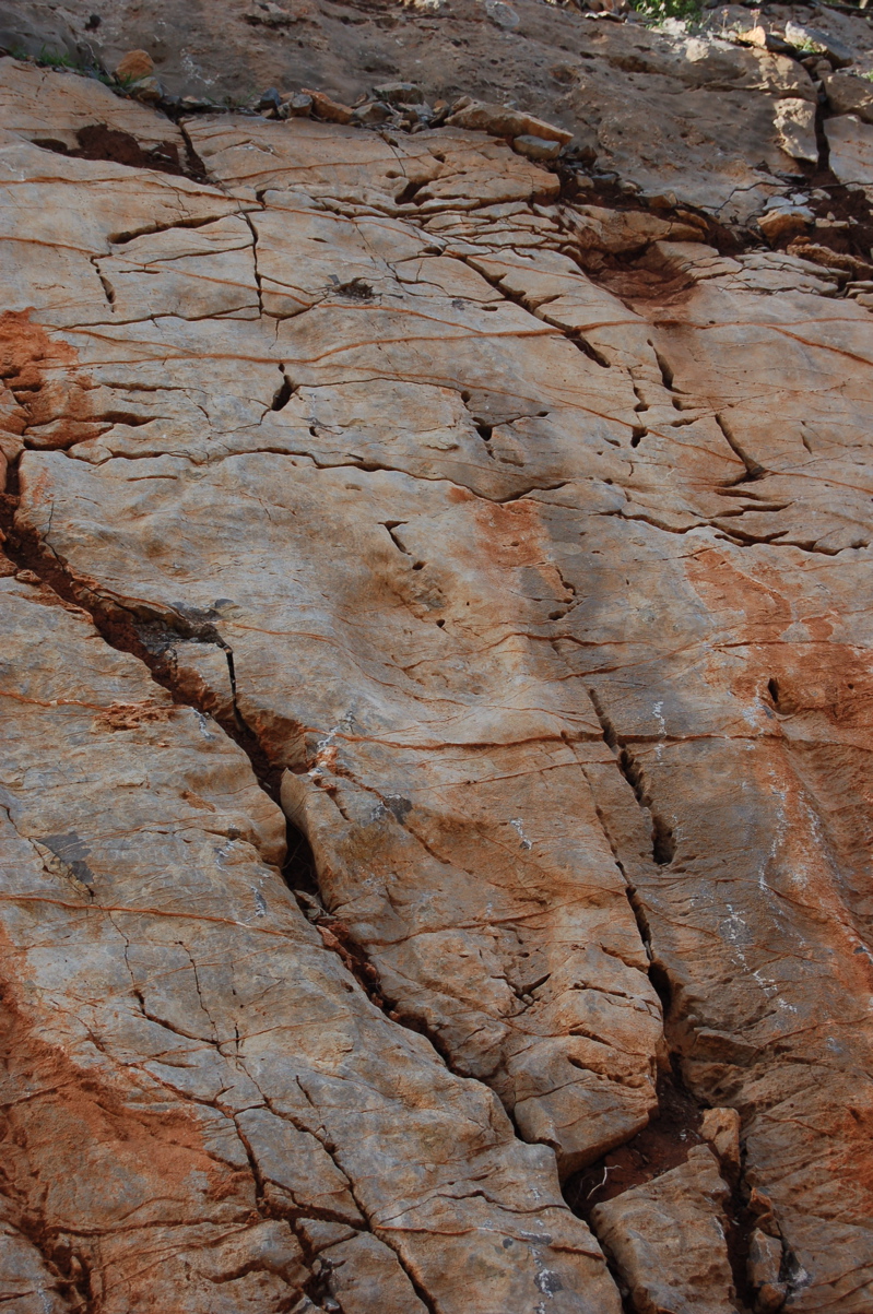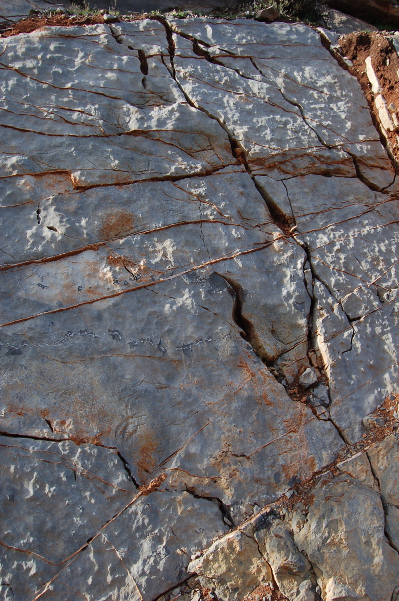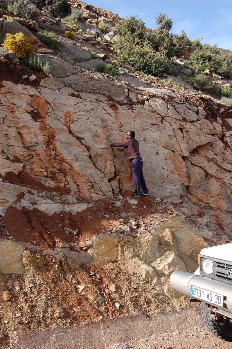 Probabilité de traces de petits sauropodes sur une strate inclinée à droite de la route.