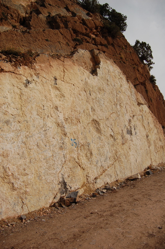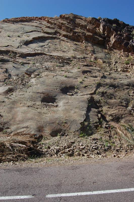 Après avoir bien observé la strate sur laquelle ont été repérées les 4 empreintes de sauropodes précédemment signalées sur notre site, il y auraient des possibilités de traces dans le voisinage, également en bordure de la route sur les plans inclinés.