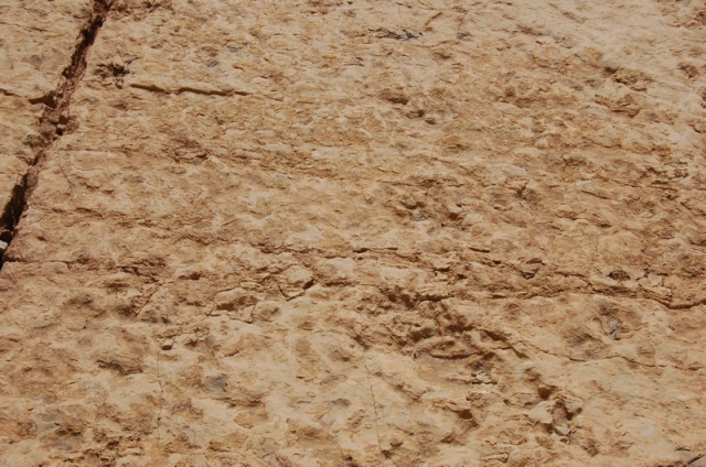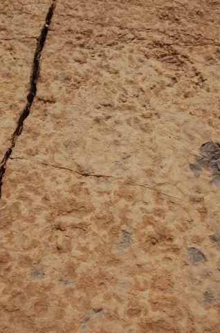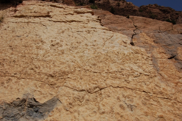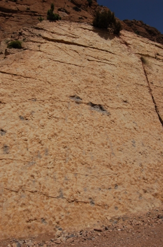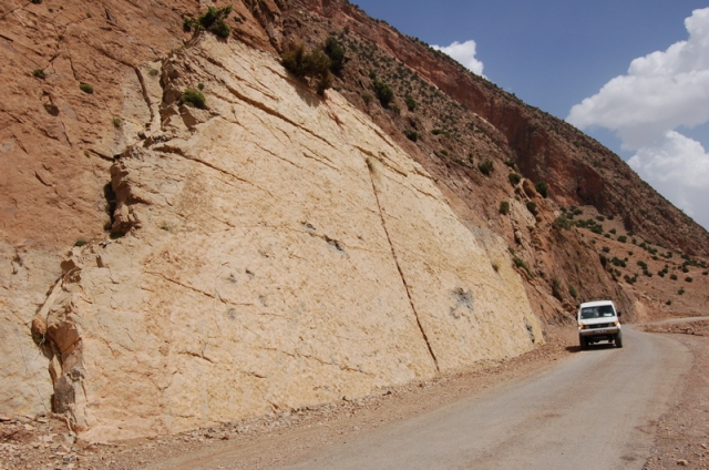 Km 9,8. 31°37,97’N - 06°30,45’W. Site potentiel à traces de dinosaures au bord de la route sur une strate pratiquement verticale.